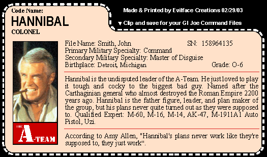 Hannibal Lt. Colonel John Smith "I love it when a plan comes together" Head: Hannibal 84 Torso: Recondo 84 Arms: Doc 83 Waist: Recondo 84 Legs: Sgt. Slaughter 86 Rifle: Cobra Officer 83 Explosives Box: Hannibal 84 Backpack: Hannibal 84